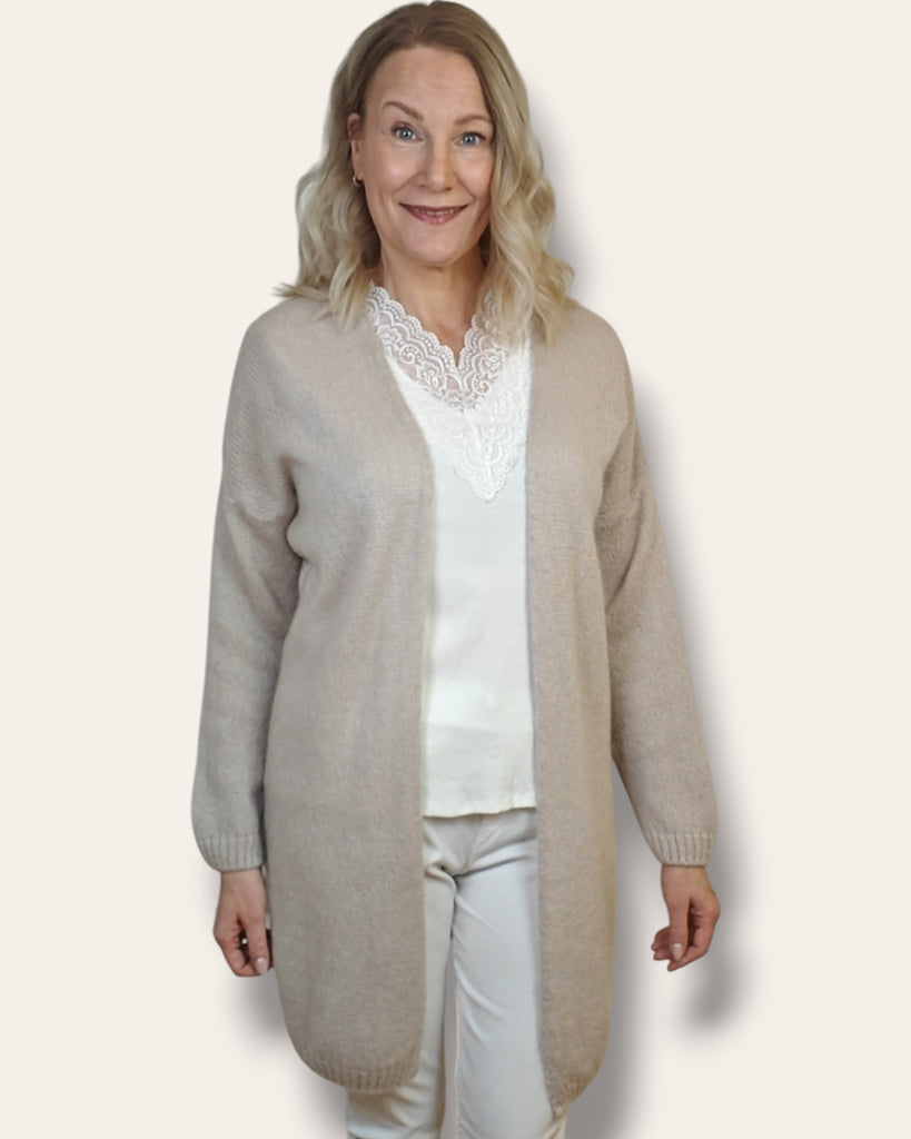 Ohuesta langasta neulottu takki on höyhenen kevyt ja ihanan pehmoinen, mutta todella lämmin ja hengittävä.