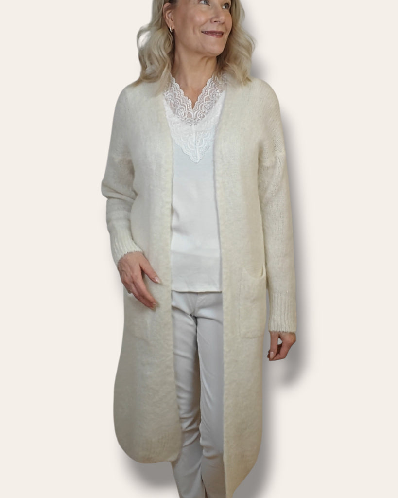 Ohuesta langasta neulottu takki on höyhenen kevyt ja ihanan pehmoinen, mutta todella lämmin ja hengittävä.