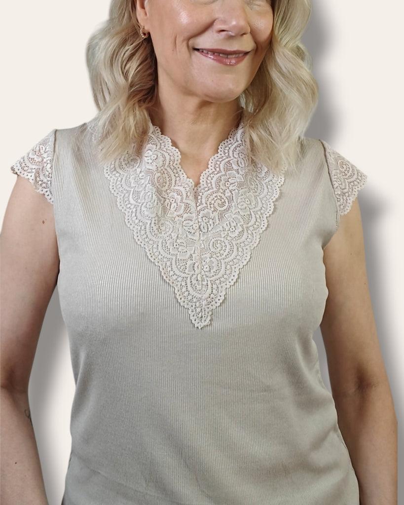 Kaunis trikoopaita pienillä pitsihihoilla ja